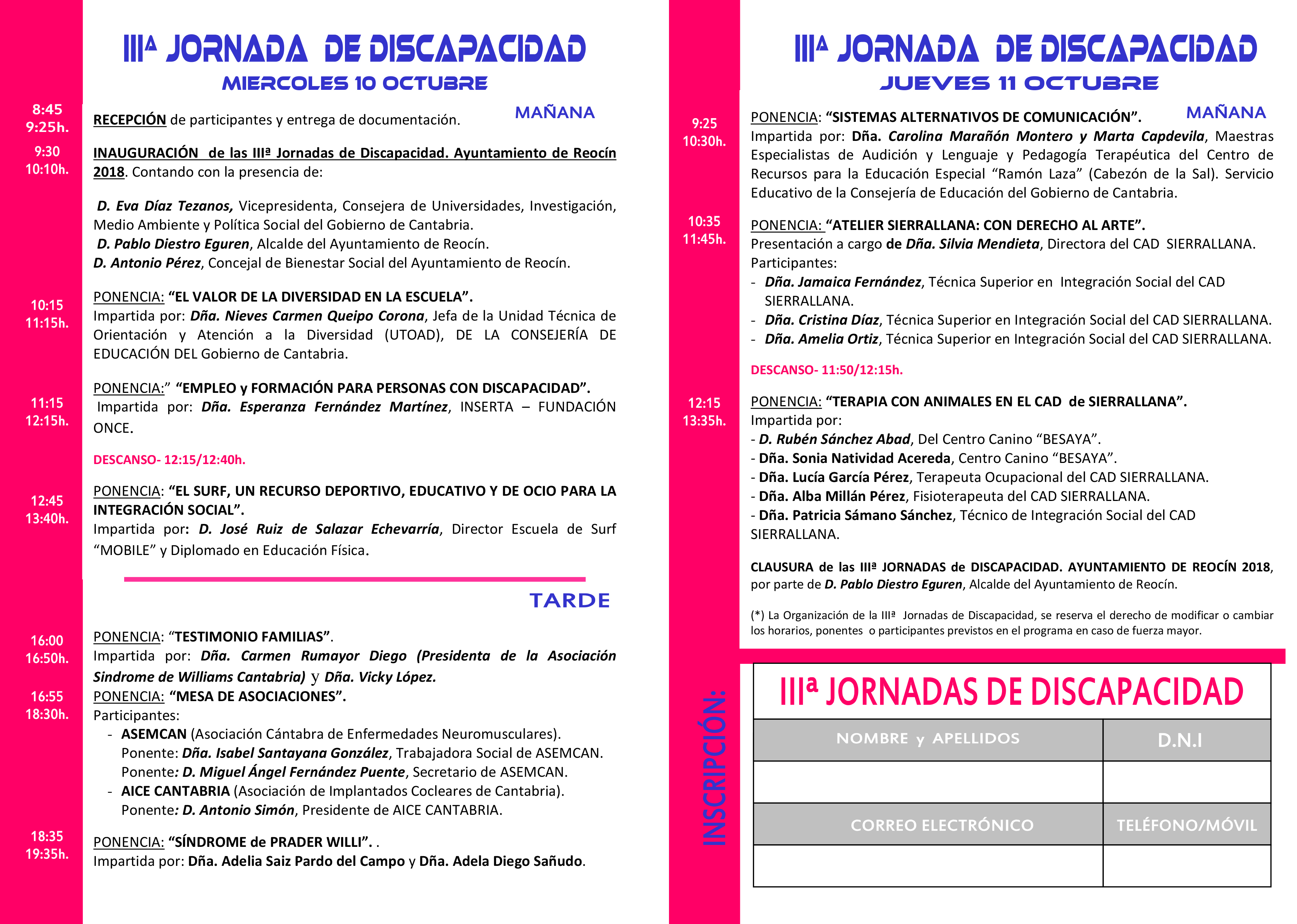 IIIª JORNADAS DE DISCAPACIDAD 2018 AYUNTAMIENTO DE REOCIN. 10-11 de OCTUBRE.